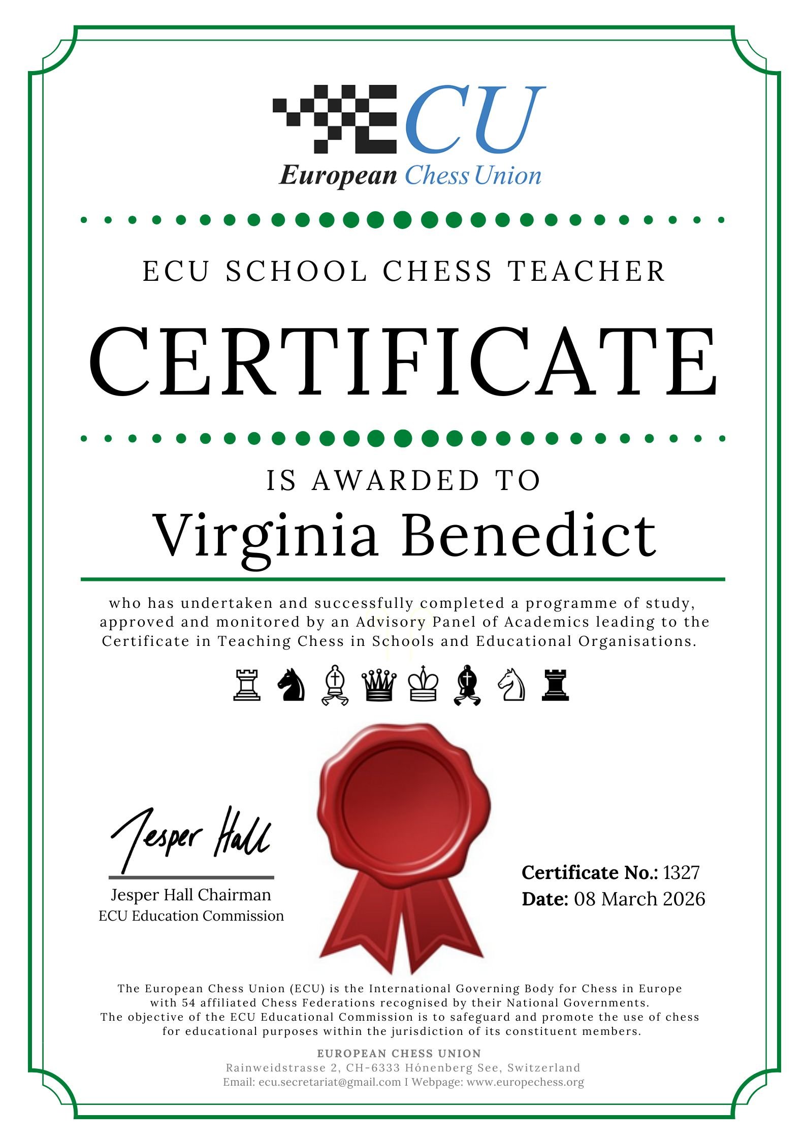 Ms. Virginia Benedict, as a member of the International Chess Federation (FIDE) serves as a volunteer during World Championships and Festivals both in-person and remote.